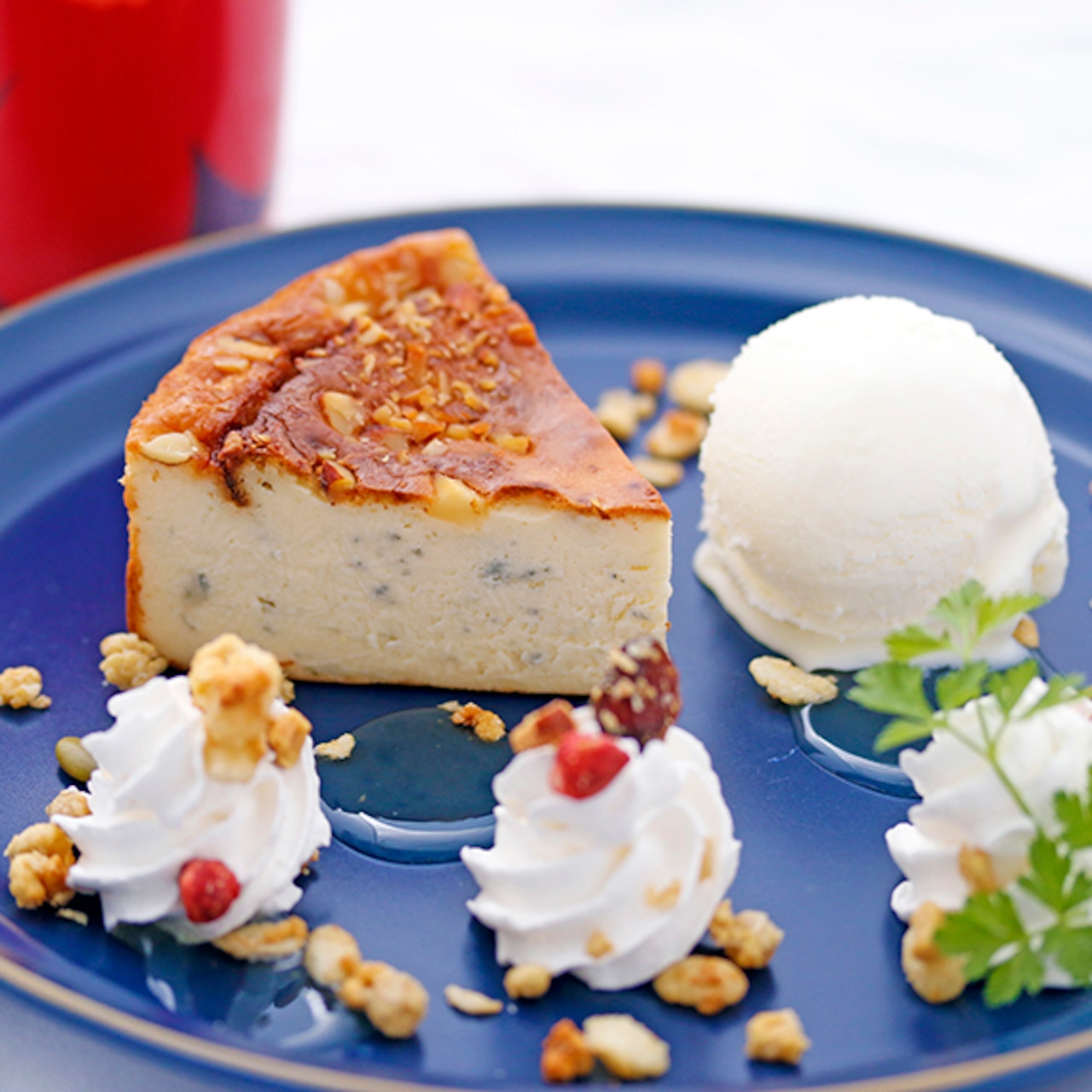 オーストラリア産のクリームチーズをベースに、少し塩気のあるイタリア産のブルーチーズとハチミツで焼き上げました。濃厚でリッチな味わいは、コーヒーや紅茶はもちろん、ワインとの相性も抜群です。しっとりとした生地と、表面を飾るナッツとの食感のコントラストもお楽しみください。